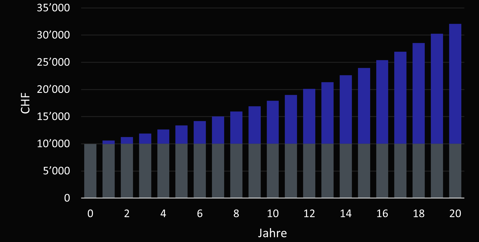 Nehmen wir an, du investierst 10'000 Franken in den Aktienmarkt und lässt das Geld dort 20 Jahre lang sitzen. Dann hast du am Schluss etwa 32'000 Franken, ohne dass du dafür etwas machen musstest.