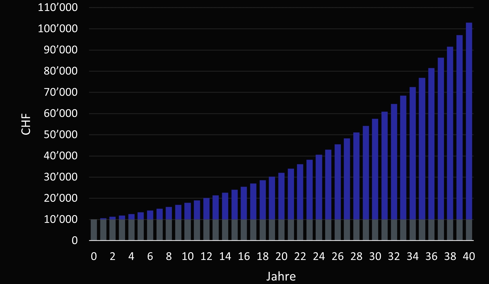 Das Tolle am exponentiellen Wachstum ist, dass dein Geld immer schneller wächst. Investierst du dein Geld mit 25 und fasst es nicht an, bis du pensioniert bist, dann hast du einen Anlagehorizont von 40 Jahren und deine 10'000 Franken vermehren sich auf über 100'000 Franken!