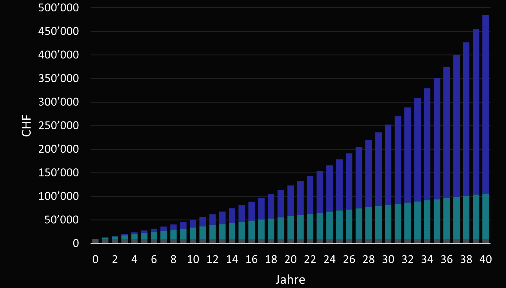 Noch besser ist es, regelmässig einen Teil deines Einkommens zu investieren. Wenn du z. B. jeden Monat zusätzlich 200 Franken investierst, dann hast du nach 40 Jahren fast eine halbe Million Franken. Mit den Einzahlungen allein würdest du nur auf 106'000 Franken kommen.
