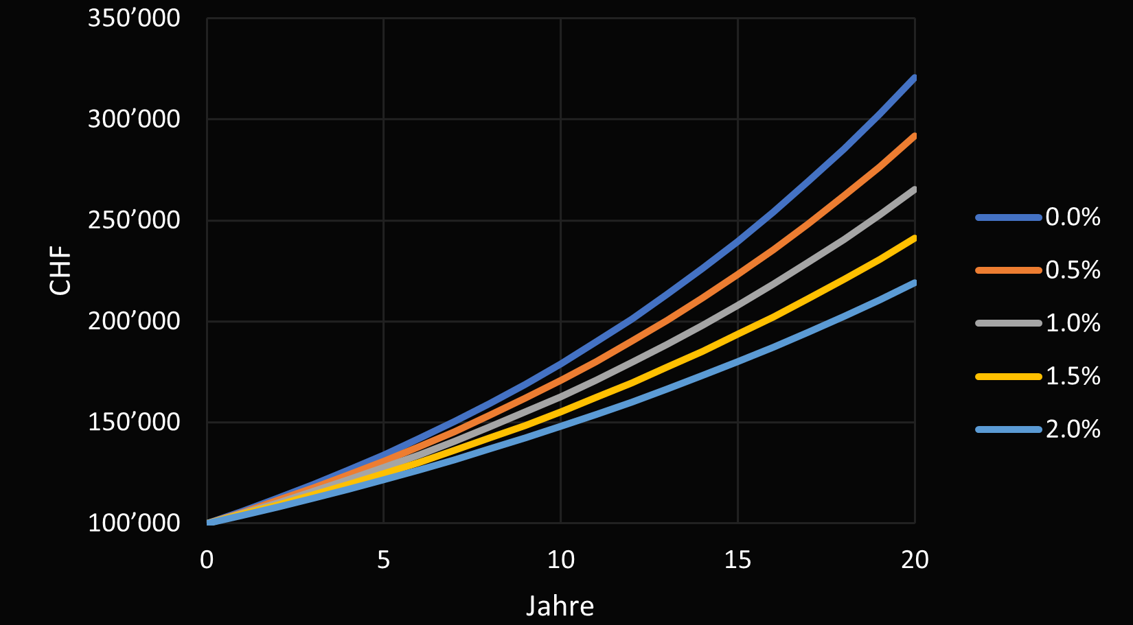Jeder ETF hat Gebühren, welche in der TER (Total Expense Ratio) angegeben sind. Das ist ein Prozentsatz, welcher jedes Jahr von deinem investierten Geld abgezogen wird, um die Verwaltungskosten des ETFs zu zahlen. Im Bild unten kannst du sehen, wie sich unterschiedliche Gebühren auf eine Investition von CHF 100'000 auswirken. Die Unterschiede sind zwar in den ersten Jahren nicht sehr gross, aber nach 20 Jahren hast du mit 0 % TER einen um CHF 100'000 höheren Gewinn als mit 2 % TER. Es ist also sehr wichtig, dass du auf diese Gebühren achtest!